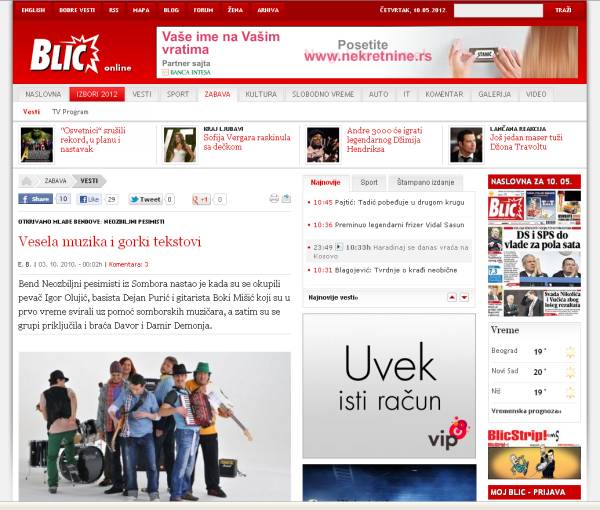 Prvi za bubnjevima, a drugi s harmonikom i klavijaturama. U procesu snimanja prvih demo snimaka, novi članovi sastava postaju klarinetista Peđa Maćuš, perkusionista Denis Jerbic i multiinstrumentalista Igor Martinko. Nešto kasnije, dotadašnjeg basistu zamenjuje Dragan Tomić i time je zaokružena postava ovog sastava. Zahvaljujući širokom spektru muzičkih interesovanja članova benda, zvuk Neozbiljnih pesimista je izuzetno bogat, a idejno i stilski najbliži sastavu Gogol Bordelo. Vesela muzika i energični nastupi karakterišu ovu grupu koja iza sebe ima jedan album „Neka bude što biti ne može“ objavljen ove godine za SKC Novi Sad. Pored brojnih samostalnih nastupa širom Srbije, a učestvovali su i na svim većim domaćim festivalima, publika u Beogradu moći će da čuje ovaj bend uživo 28. oktobra u klubu Akademija.